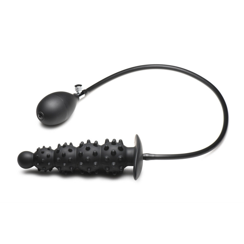 Measurements Overall length 30 inches. Deflated 6 inches insertable length, 2 inches widest insertable diameter. Inflated 7.75 inches insertable length, 3 inches widest insertable diameter. Materials Plug Silicone Hose and bulb PVC, metal Color Black Key Features Heightened Sensations This stimulating, textured plug is covered with soft, round spikes. The beads of the plug get bigger the deeper you go. Inflatable This plug inflates to increase pressure inside your rear while inserted. Comes with a quick-release valve for slow or quick deflation. Easy Insertion the firm inner core makes insertion easier by giving you something firm to push inside. Premium Silicone this plug is made out of premium, phthalate-free, body-safe silicone. Use only water-based lubricants for best results.