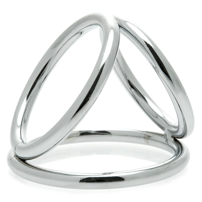 The Triad Chamber brings the art of domination in threes. This chrome cock cage features three differently sized O-rings with which you can ensnare your pet. The largest ring goes around the cock and balls like a normal cock ring. The middle sized ring goes around the balls, providing the wearer with a pressure sensation. The third ring goes around the base of the penis to help you maintain the kind of erection that lasts for extended sessions. The Triad Chamber is perfect for the experienced user who wants a sleek and modern look, but seeks a weighted, more supportive cock ring.